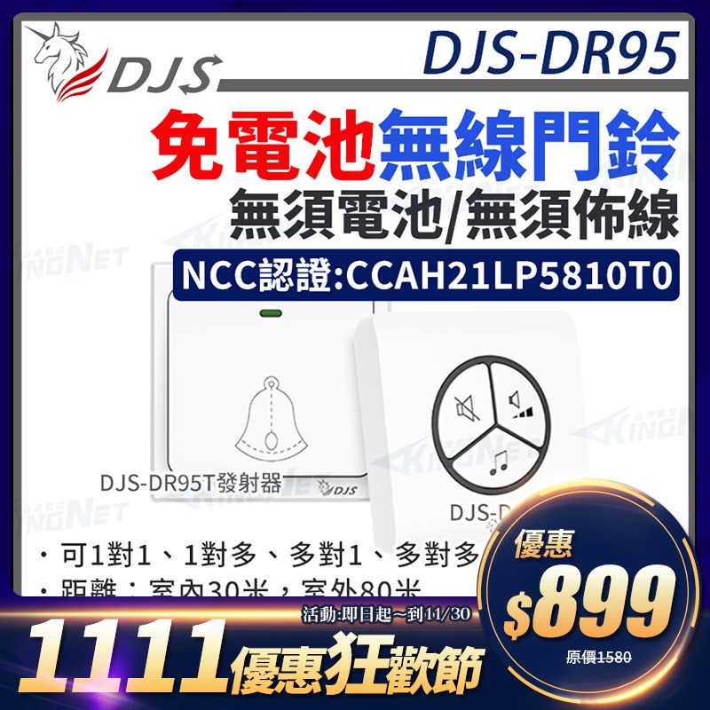 1111下殺~【帝網 KingNet】免電池無線門鈴 台灣NCC合格認證 自發電 無線電鈴 DJS-DR95