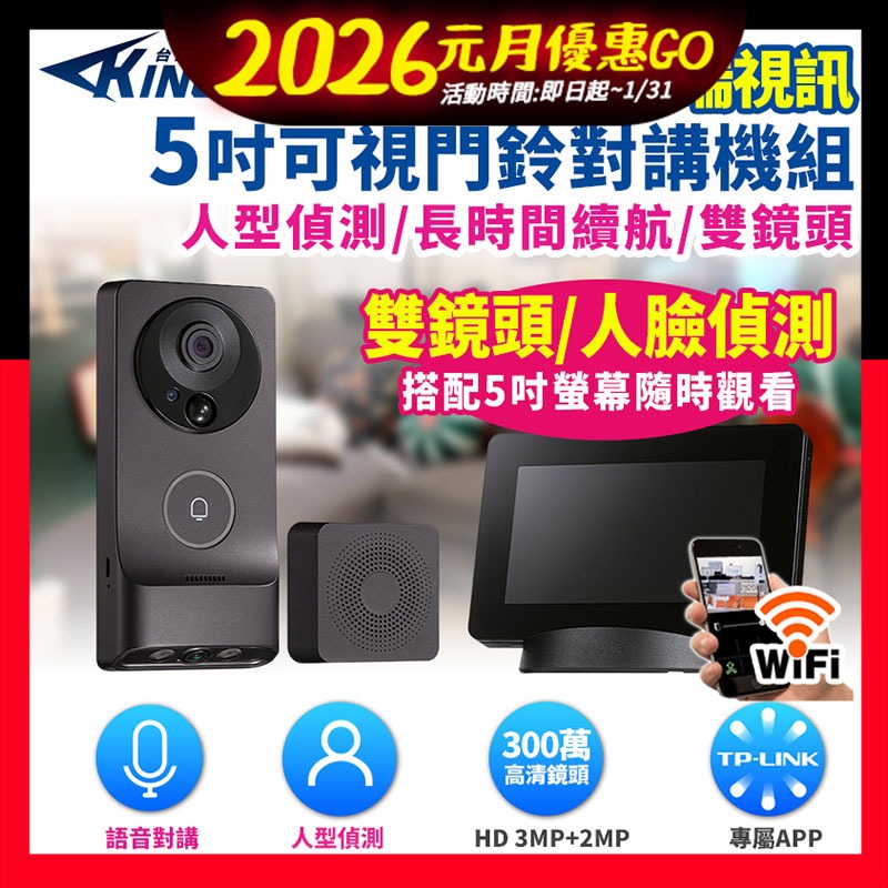 限時優惠~【帝網KingNet】 WIFI 遠端視訊 門鈴 對講機組 5吋對講機組 雙鏡頭 1080P 300萬 防水紅外線夜視 WIFI門鈴 H.265 門口機