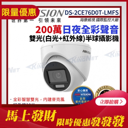 限時優惠~【HIKVISION 海康】DS-2CE76D0T-LMFS 200萬 日夜全彩 雙光 同軸聲音 半球攝影機 白光 紅外線 IP67 監視器攝影機 帝網 KingNet