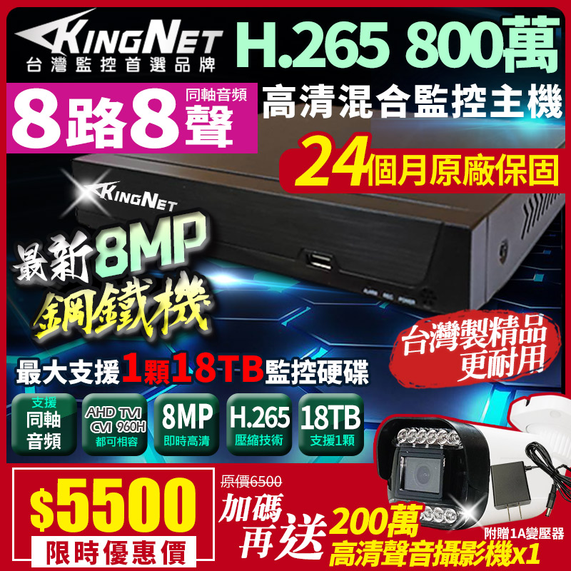 帝網KingNet 800萬 H.265 8路主機 AI智能偵測 台灣製 數位錄影主機 DVR 監視器主機 鋼鐵機 監控主機 買就送 200萬同軸聲音槍型攝影機