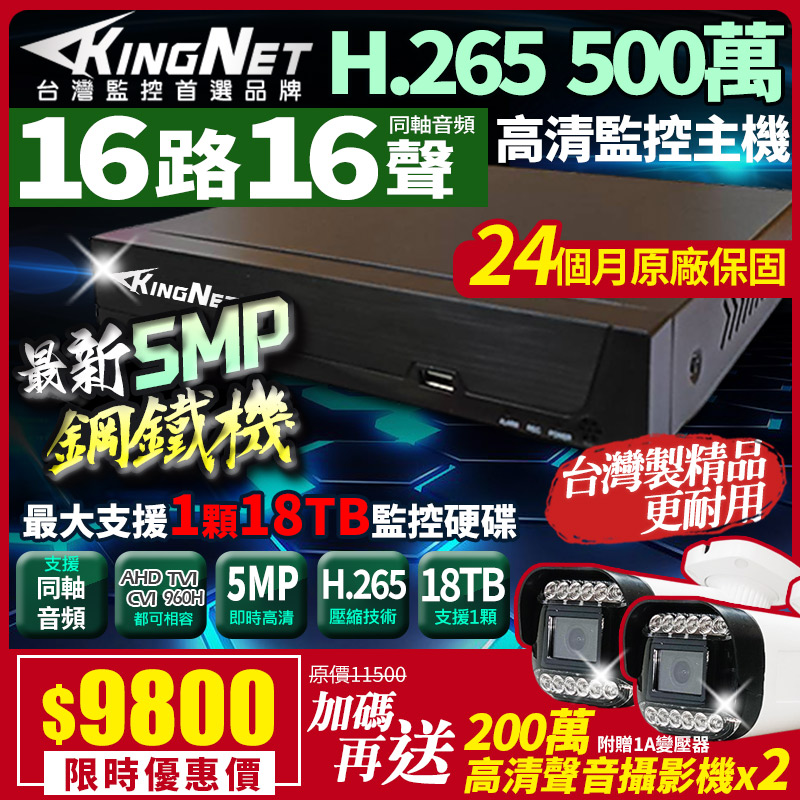 帝網KingNet 500萬 H.265 16路主機 台灣製 同軸音頻 數位錄影主機 AI智能偵測 DVR 監視器主機 鋼鐵機 買就送 200萬同軸聲音槍型攝影機*2